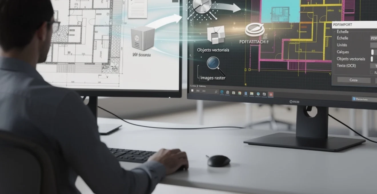 Lorsque la commande PDFIMPORT ne suffit pas ou que le PDF est principalement constitué de données raster, AutoCAD Raster Design et la fonction de sous-couche PDF (PDF Underlay) deviennent des outils incontournables. Ces solutions s’adressent particulièrement aux utilisateurs qui doivent reprendre des plans scannés, des archives papier ou des documents hétérogènes fournis par différents partenaires. Plutôt que de tenter une conversion automatique hasardeuse, vous structurez un processus de vectorisation maîtrisé.