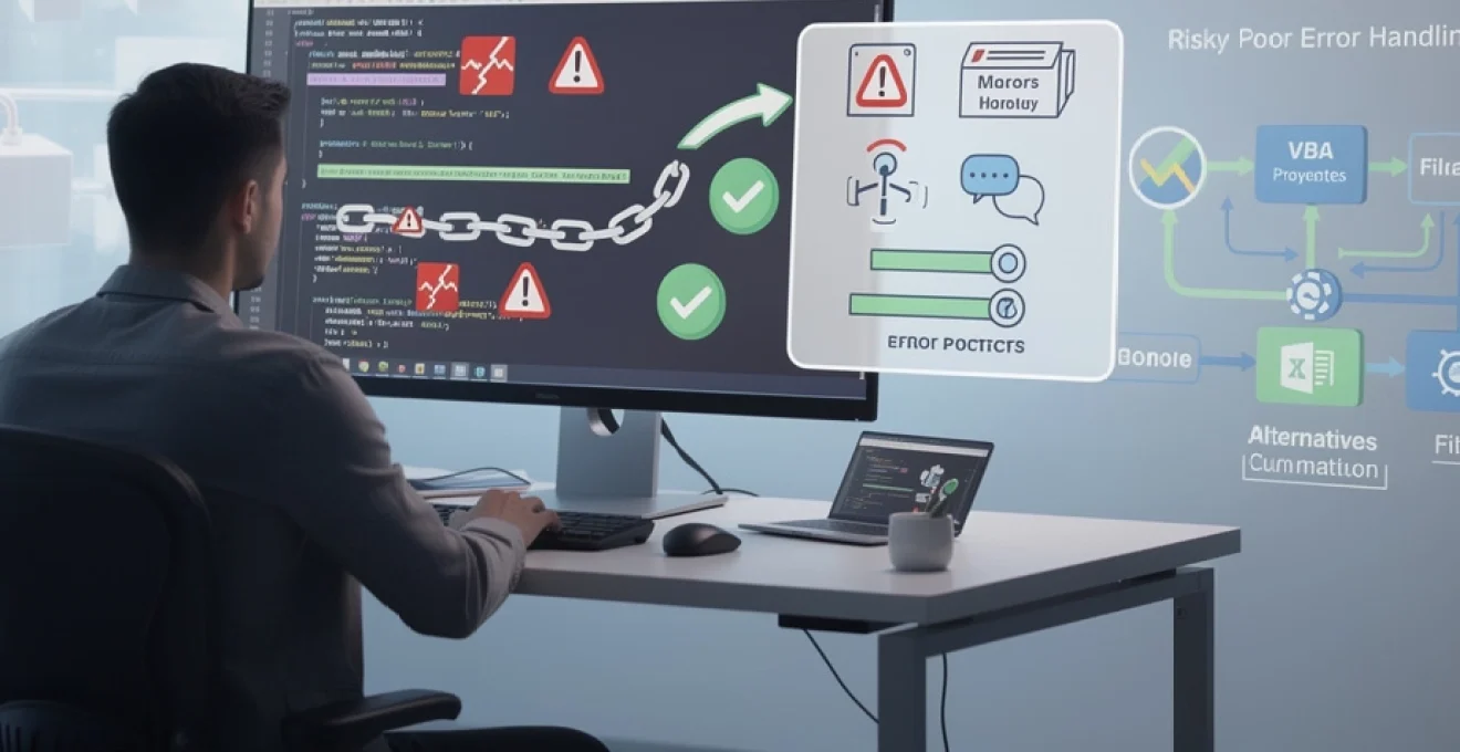 Sur le plan de la sécurité et de la robustesse, ignorer des erreurs peut conduire à des situations dangereuses : données partiellement mises à jour, fichiers non fermés, transactions inachevées, ou encore violation de règles métier. Dans un contexte d’automatisation de traitements financiers ou de reporting réglementaire, un On Error Resume Next mal placé peut entraîner des décisions prises sur la base de chiffres erronés, sans qu’aucune alerte ne soit déclenchée. La meilleure protection consiste donc à limiter strictement la portée de cette instruction, à toujours la désactiver ensuite avec On Error GoTo 0, et à vérifier systématiquement Err.Number dans les zones critiques.